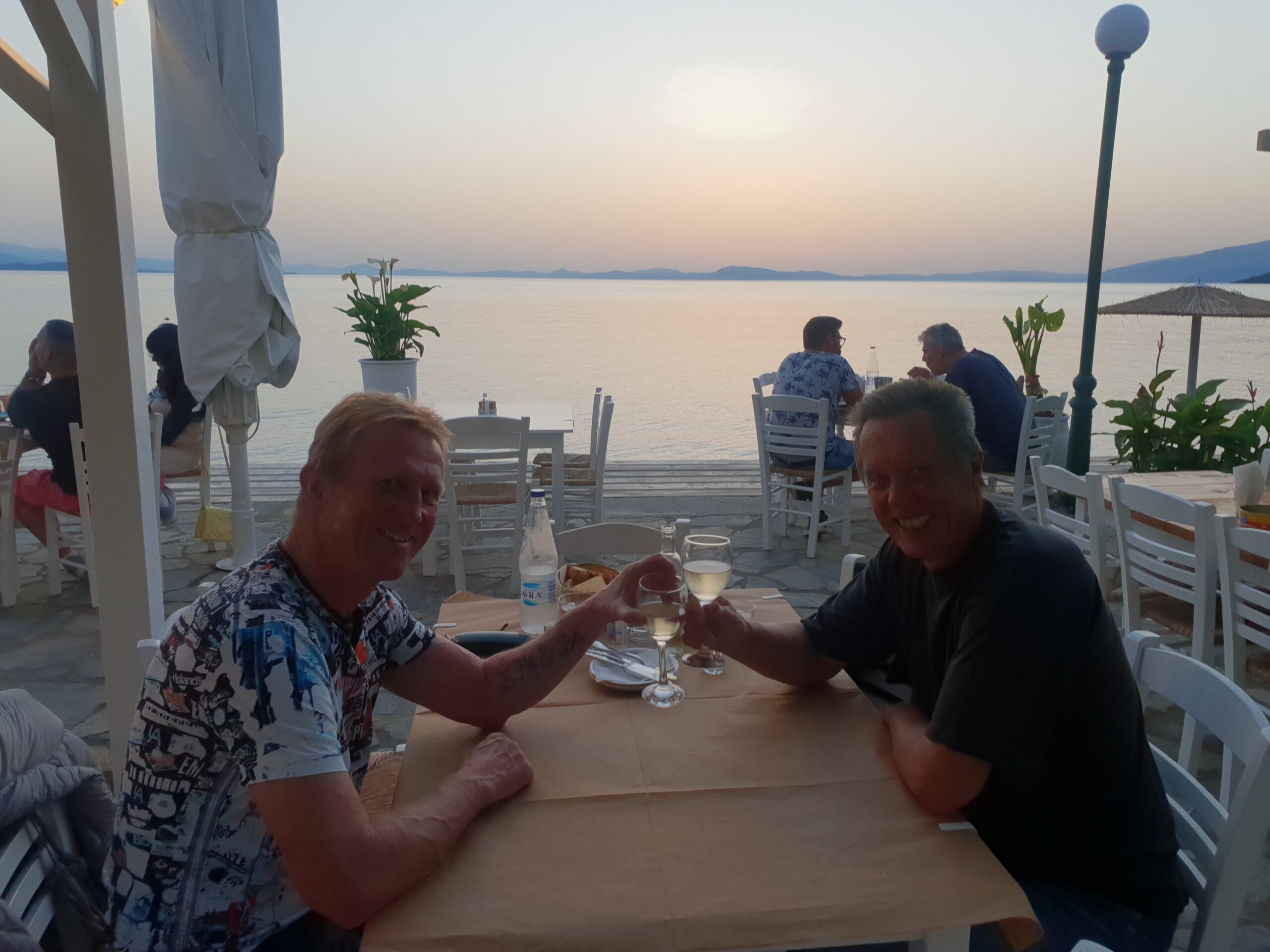 Mit Schokocroissant von der Bäckerei, saßen wir wieder bei Capucchino an der Strandpromenade im Caffee Aktion. Relaxen pur ! Aber nicht lange und es ging wieder zum Boot, das uns sehnsüchtigst erwartete. 7 Stunden war der Arbeitstag lang. Nach dem Abschleifen des Antifouling Anstrich vom Unterwasserschiffes gingen wir, blau wie die Schlümpfe, ins etwa 17 Grad warme Meer reinigen. Schee wors. Danach genehmigten wir uns das erste Bier, das uns bei der Hitze jegweilge Weiterarbeit sehr erschwerte. 18:00 Uhr Tsatsiki, Mythos und Caffefrappe. Duschen schön machen und Essen gehen.